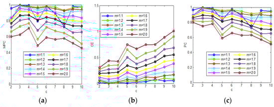 In general, cluster validity indices (CVIs) are used to assess the suitability of the partitions shaped by clustering algorithms and are commonly used to determine an appropriate clusters number for the datasets [12]. The most used fuzzy CVIs linked to FCM are the partition coefficient (PC) [38] and the partition entropy (PE) [39], which both only use fuzzy memberships obtained by the FCM algorithm. Since the geometry of data cannot be taken into consideration by these indices, the fuzzy hypervolume (FHV) was introduced by Gath and Geva [40]. The XB validity index introduced by Xie and Beni [41] is based on fuzzy memberships and the geometrical structure of data with its objective function, and Wu et al. [42] gave the robust-type CVIs. However, the FHV and XB validity indices are not fitted for multiview FCM clustering algorithms even though we modify them by considering the multiview FCM objective functions. In this sense, for the multiview FCM clustering algorithms, we use PC, PE, and MPC as the validity indices.