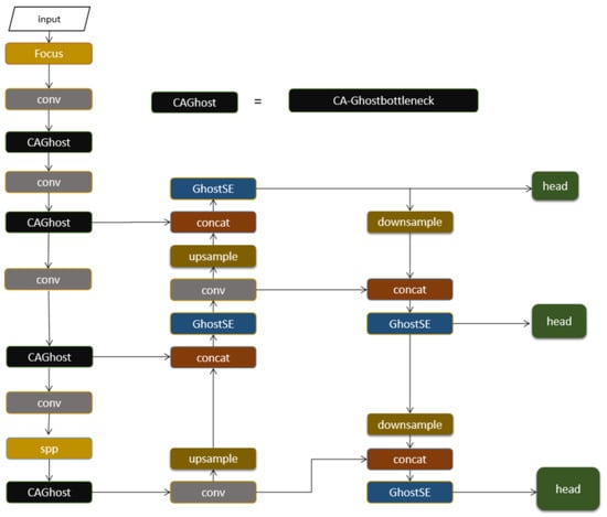 Parameter-efficient: it is more advantageous in terms of parameter efficiency compared to SE Attention, which is realized by simple linear transformations and softmax operations, making it more feasible in the case of limited computational resources. The design of Coordinate Attention makes it more flexible and can be used in combination with other attention mechanisms. Combining the various features mentioned above, Coordinate Attention has good assistance in improving the capture of spatial and positional information of features, improving the ability of module feature extraction, and reducing the number of parameters of modules. In the Neck part of the input feature map, already contains a large amount of feature information, in the original Neck, the SE attention and Ghost module are used to improve the C3 module, reduce the number of parameters of the module and the extraction of channel features, and the overall structure of the model is shown in Figure 1.