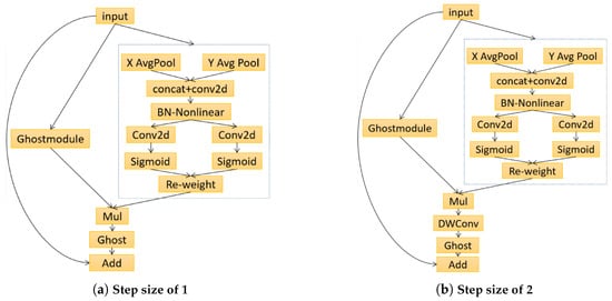 CA-GhostBotelneck (shown in Figure 2), as a key network module in the backbone network, adopts ideas from GhostnetV2 [28]. The CA-GhostBotelneck in this paper takes into account the fact that the Ghost module is only half functional and the nature features are smaller than the original output features, and when extracting the features for the input feature map , the output is obtained, and the features of Y are lost in both the channel information and the position information. In this paper, the input X is processed in two stages. First, the sparse feature map Y is obtained by the Ghost module, and second, the channel information and position information are obtained by the CoordAttention module, and finally, the two parts of the features are integrated to obtain a new output. The benefits of using CA-GhostBotelneck are as follows:
