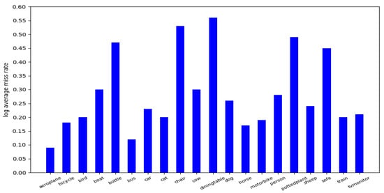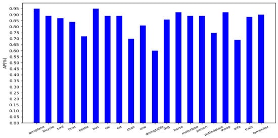 The partial detection results of the GC-YOLO model are shown in figures. Figure 4 shows the harmonic mean F1 after training the model on the VOC dataset with the threshold set to 0.5. The F1 value combines the accuracy and completeness of the model, and is particularly useful for dealing with category imbalance or focusing on improving both accuracy and recall. Higher F1 values are an indication of better model performance in positive sample detection and negative sample exclusion, from the twenty categories in the figure, it is evident that the F1 values of 12 categories are higher than the average value of 0.72, and there are only a few major fluctuations, which proves that the model achieves a relatively balanced performance in different categories, has a better generalization ability in each category, can adapt to different categories, and has an advantage in dealing with multicategory problems; Figure 5 shows the average accuracy of the model mAP on each category, combining the prediction accuracy and recall of the model on different target categories, which is used to measure the overall performance of the model on multiple target categories, as shown in the figure, the data are more tightly clustered, with 13 categories exceeding 84.19%, five categories surpassing 90%, and two categories falling below 70%. This suggests that the model is successful in accurately localizing and identifying the target object across multiple categories, without excessively focusing on certain categories and disregarding others, and with exceptional overall performance. Figure 6 shows the "loss rate" of the model, especially in the security and surveillance area. It reflects the proportion of targets missed by the model during target detection, and a lower leakage rate indicates that the model performs better in target detection and is able to capture targets more comprehensively, from the figure, it is evident that the leakage rate is mainly below 0.3, with five categories exceeding this threshold. However, the highest leakage rate is only 0.56, indicating that the model has a high recall rate and can detect most of the target objects. It is also robust to the size and location of different targets, ensuring a consistently low leakage rate.