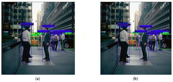 (a) GC-YOLO model detection results; (b) original model detection results. In this context, blue boxes indicate people, while green boxes represent cars. Compared to Figure (b), Figure (a) displays superior accuracy in identifying individuals, successfully detecting the concealed yellow car, and demonstrating an increased confidence in identifying the black car. Furthermore, there is a decreased likelihood of misidentifying a person as a vehicle.