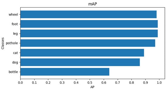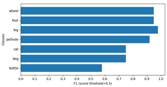 It was found that the visual angle of wheelchair blindness is different from the unusual visual angle, and is more a differentiator caused by the low viewing angle, which is reflected in the overhead angle and the incompleteness of the display target. In this paper, dangerous obstacles for wheelchair blindness in the community are defined as cats, dogs, potholes, water bottles, and feet, legs, and wheels at the top view, and the seven categories are designed to avoid physical injury from animal attacks, falls, and wheel accidents. For this purpose, field targets were collected for dataset production, mainly through mobile phone simulation of wheelchair heights and perspectives in different scenarios, based on different age groups, scenarios, and time periods, to build diverse sample data. In this paper, the captured video data are processed, and the video file is sliced by frames, and one image is selected every ten frames to obtain the foot and leg photos under different angles and different poses. To ensure the diversity of the dataset and the amount of data, some of the categories of the dataset were obtained from publicly available datasets and web crawling, respectively, totaling 7916 image data. To solve the problem of unbalanced data volume in the target dataset, this paper sets the data enhancement rate of mosaic to fifty percent, which expands the data diversity and improves the generalization ability of the training model. The experiment is shown in Figure 9, and the precision for various categories exceeds 0.85, some even surpassing 0.95. The model demonstrates excellent robustness in its capacity to generalize across targets of differing sizes such as feet, legs, and wheels. which shows that the performance of the overall model on the custom dataset is relatively stable, with a mAP of 90.34%, and Figure 10 shows that the average accuracy of the F1 values is 0.84 at score threshold = 0.5, on the custom dataset, the F1 score is no worse than the average of the model trained on the VOC dataset (0.72), and the model can adapt to different categories, demonstrating its ability to generalize.