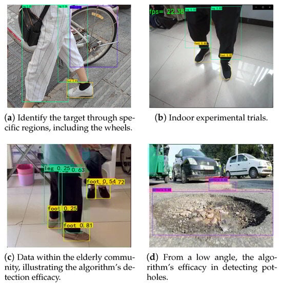 The trained model is tested in real scenarios, and the results of the test scenarios are shown in Figure 11. For intelligent wheelchair obstacle detection in the blind zones on both sides of the wheelchair in a senior living community environment, side safety is judged mainly based on the display of incomplete targets. The four images reflect wheels, legs, feet, and potholes in low vision, and the first three images judge obstacle targets based on human targets with incomplete displays in low vision.