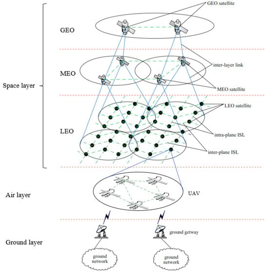 Recently, MLSNs (Multilayered Satellite Networks) have been put forward as a feasible design for next-generation satellite networks. Hierarchical architecture and many satellite networks are combined to create MLSNs. A typical bilayer MLSN consists of a low earth orbit (LEO) constellation and a medium earth orbit (MEO) constellation interconnected by intersatellite connections (ISLs) to create a mesh or ring topology. Furthermore, interlayer linkages (ILLs) connect satellites at various levels. Ground-satellite linkages (GSLs) allow terrestrial users to connect satellites at various levels. By integrating these diverse networks, we can improve the capacity, dependability, and performance of global communications. Figure 1 shows a portion of a multilayer satellite network, where GEO, MEO, and LEO satellites cover the terrestrial gateways. Packets are routed independently to the target gateway after being delivered to the satellite network across a number of satellite hops, perhaps in various layers. Routing decisions made in satellite networks are separate from those in the terrestrial networks.