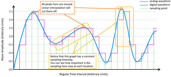 In choosing a suitable time step for a model, it is important to not only ensure numerical stability but also to ensure that the time step is sufficiently small to mitigate the risk of missing the peak of a wave at a sampling point. The chosen computation interval provides valuable opportunities to characterize the traffic load, but the value of these opportunities varies over the course of the simulation and should be leveraged accordingly. To further illustrate this point, consider the example of converting analog music to digital, as shown in Figure 3. The wave must be sampled at regular intervals, indicated by the vertical green arrows. A greater number of arrows per sampling point increases the number of interpolation points, resulting in a more defined wave, while fewer arrows provide less definition.