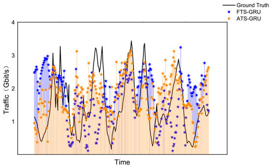 We compare ATS-GRU with the traditional time series network traffic prediction method (FTS-GRU). To ensure a fair comparison, the two prediction methods used the same number of hidden layers. Figure 5 shows the prediction results of both methods on traffic flow within the same time span. To begin with, the results suggest that the FTS-GRU model exhibits relatively lower accuracy. This is primarily attributed to its tendency to produce predictions that closely align with the average traffic volume for the entire prediction period at each time point. Consequently, this approach may struggle to effectively capture fluctuations and abrupt shifts in traffic flow, potentially leading to inaccuracies in certain scenarios. Conversely, the ATS-GRU model excels in enhancing prediction accuracy by forecasting both the overarching trends and sudden fluctuations in traffic volume. As traffic flow undergoes changes, this model dynamically adapts by reducing the time step as the speed increases. This dynamic adjustment allows the prediction model to more adeptly capture rapid shifts in traffic flow, resulting in more precise prediction outcomes.