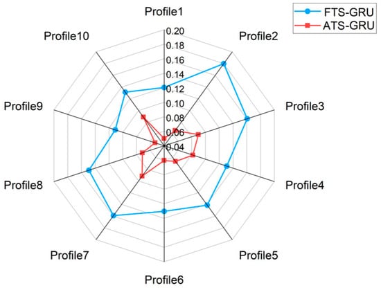 In addition, we compare the average prediction error of both methods on ten traffic flow profiles using the NRMSE metric, as shown in Figure 6. Consistent with expectations, the ATS-GRU model has significantly lower prediction error than the FTS-GRU model for all traffic flow profiles, thus reinforcing the superior prediction performance of the ATS-GRU model. The difference in error between ATS-GRU and traditional FTS-GRU primarily stems from the differences in the time-stepping size used for prediction. As mentioned earlier in the article, FTS-GRU employs a fixed step size for data sampling to complete predictions. Regardless of whether this step size is large or small, it is challenging to accurately forecast data within each time period because a dataset invariably contains instances of both small and large fluctuations in traffic volume. In contrast, ATS-GRU can precisely monitor traffic fluctuations through error feedback and dynamically adjust the time-stepping size based on these fluctuations. Therefore, it can be confidently stated that the predictive performance of the ATS-GRU model is superior to that of the FTS-GRU model, with errors approaching zero.