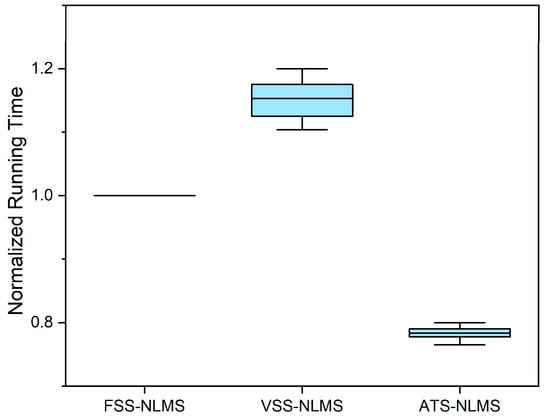 Figure 7 exhibits the normalized processing time for the three NLMS-based prediction methods. The comparison of different methods’ processing time is essential in determining the efficiency of each method. To avoid the reliance of simulations on specific hardware resources, the FSS-NLMS method’s running time is set to one. The VSS-NLMS and ATS-NLMS methods’ running time is then normalized based on this criterion. The superior computational efficiency of ATS-NLMS is evident in Figure 7, where it demonstrates significantly lower normalized running times compared to FSS-NLMS and VSS-NLMS.