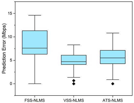Furthermore, ATS-NLMS boasts another significant advantage compared to FSS-NLMS and VSS-NLMS. As shown in Figure 8, the box plots of the prediction errors for the three prediction methods are presented. ATS-NLMS and VSS-NLMS exhibit similar predictive performance, which is significantly better than that of FSS-NLMS, with only a few simulations demonstrating the opposite. Neglecting these isolated simulation points is acceptable because the focus is on the overall effectiveness of the methods. ATS-NLMS stands out with a lower average sampling rate, as depicted in Figure 7 and Figure 8. These figures demonstrate that while FSS-NLMS and VSS-NLMS achieve a time step size of 420 s using the identical simulation configuration, ATS-NLMS surpasses them with a time step size of 371 s. Consequently, ATS-NLMS attains the lowest sampling rate among the three methods, leading to a substantial reduction in sampling overheads.