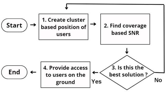 The heuristic involves four stages: (1) the clustering of users using k-means clustering, (2) the allocation of users to the nearest UAV-BS and the verification of its quality of service, (3) the evaluation of the best solution based on the number of users served, and (4) granting access to ground users, as are shown in Figure 3.