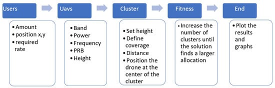 Initially, the users started out with a defined lat/log position and their required data rate. After this, the UAV-BSs were configured with suitable parameters for the band, frequency, altitude, and available resources. Then, the k-means cluster set the altitude, defined the coverage and distance, and positioned itself in the center. Following this, the QoS was evaluated to ensure that the maximum number of users could be serviced by the drone. Finally, the solution found was then used, as is shown in Figure 4.