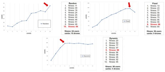 The best ‘fitness’ obtained in each algorithm is shown below, with red arrows highlighting the optimal solution. In the Random approach, 64 users were covered in iteration 10 using 10 UAV-BSs, and 36 users remained uncovered. In the Fixed approach, 96 users were covered in iteration 9 using nine UAV-BSs, and 4 users remained uncovered. Finally, the Dynamic approach covered 98 users in iteration 5, leaving only 2 users uncovered, with the help of five drones. This shows that the recommended algorithm was able to find the optimal solution more efficiently, as is demonstrated in Figure 6.