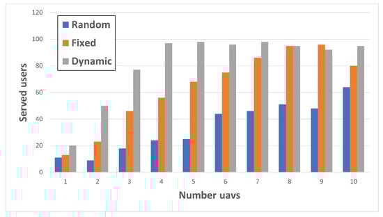 The results obtained by [38] showed that a minimum number of five UAV-BSs was required to cover the studied area and 76% of the users served. The Dynamic Strategy showed that four UAV-BSs were needed to cover the studied area and all 200 users served, thus reaching a service of 100%. The results can be seen in Table 6.