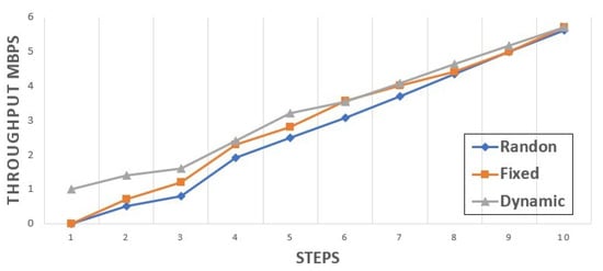 Another comparison was made to evaluate the average user throughput. The Dynamic Strategy (c) outperformed the Fixed (b) and Random (a) positioning, as is shown in Figure 9.