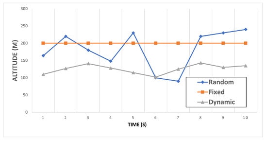 The flight data provides information about the altitude and battery energy consumption of each UAV-BS. There were three types of positions for the UAV-BSs: (a) random positions at different altitudes, (b) fixed positions at specific altitudes, and (c) dynamic positions that placed each UAV-BS at an ideal altitude; note that the UAV-BSs flew lower to avoid stronger gap winds that could destabilize them. The strategy of keeping the UAV-BS closer to the ground saved energy by avoiding large wind gusts and reducing the amount of energy needed to maintain stability in the air. This is illustrated in Figure 10 and Figure 11.