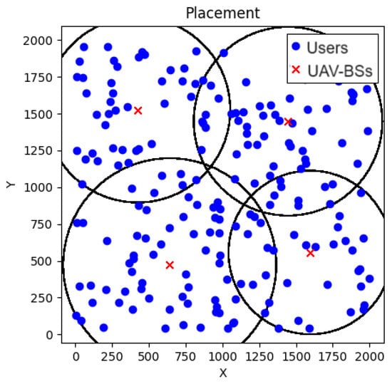 The algorithm positioned the UAV-BSs horizontally, and 2D deployment of the allocation can be seen in Figure 13.