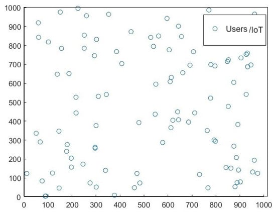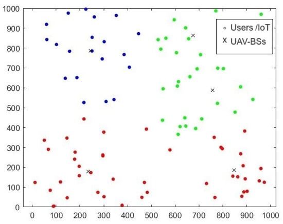 The chosen scenario was based on a natural disaster that causes a failure in the base station and prevents mobile user/IoTs sensors from being able to connect to the network. Users undertake the simulation on the basis of a uniform distribution [34], with network requirements of 1 to 3 Mbps. A total of 100 stationary users were selected in the specified geographical area of 1000 × 1000 m. The network used was the LTE standard, and the UAV-BSs had a bandwidth of 20 MHz, with resource blocks limited to 100. Each drone could connect to a macrocell with 40 Mbps. All the parameters are shown in Table 2.
