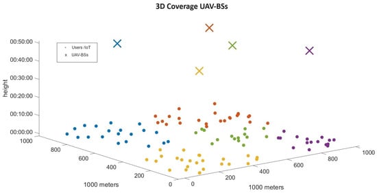 In these scenarios, it should be noted that there was a three-dimensional movement of the UAV-BSs for the mobile user/IoTs sensors. Each UAV-BS was designated a number and color, and each was located at the center of its respective user group. By flying at a particular altitude and radius, as well as by employing a specific average power signal, the UAV-BSs optimized network resources to enhance user satisfaction while reducing resource consumption. For further details, please refer to Figure 15.