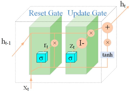 As shown in Figure 1, is the reset gate, is the update gate, is the input at the current moment, and and are the outputs at the current and previous moments. The GRU parameters are calculated as follows: