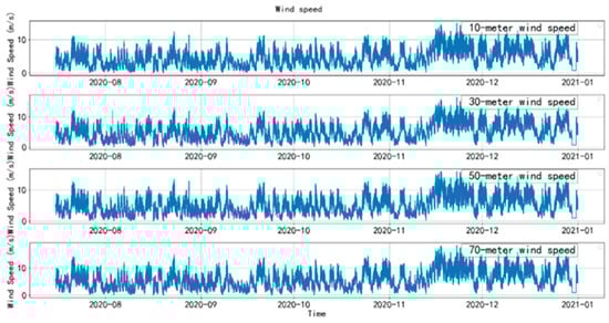 - Anemometer tower wind speed signal: Wind speed directly influences the amount of wind power generated. From observations at wind farms, wind speed data falls into four categories: 10 m, 30 m, 50 m, and 70 m wind speeds;