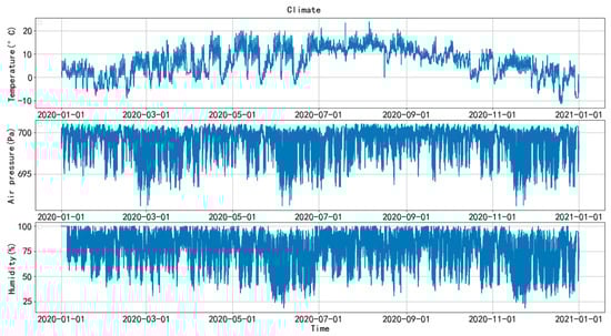To validate the accuracy of the predictive method proposed in this paper for wind power plant output prediction in practical applications, experimental verification was conducted using data collected from a wind power plant in Sichuan Province over the course of one year in 2020. The dataset consists of 1440 data points per day for each influencing factor and wind power output, collected at 1 min intervals. These data are classified into four main categories: wind speed, wind direction, weather, and historical output, as illustrated in Figure 4, Figure 5, Figure 6 and Figure 7, respectively. Their characteristics are shown in Table 1. For model training, 70% of the complete dataset is employed, with 25% reserved for validation, and the remaining 5% designated for prediction.