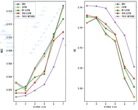 According to Table 3 and Figure 8, our proposed method performed better than other models in terms of R2 and MSE. Even when the prediction window size increased, our method continued to exhibit superior performance. Additionally, it was more consistent, and its performance decline over time was comparably more gradual.
