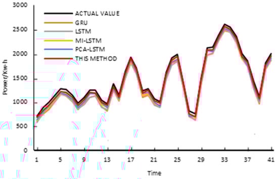 Experimental Environment: We carried out the simulations on an Intel (R) Core (TM) i5-8250U processor. The algorithm model was built using the Python 3.7 language. To show the effectiveness of the CNN–GRU prediction model based on multichannel signals proposed in this paper, we compared it to other models for verification. These included the GRU model, LSTM model, Mutual Information Theory–LSTM model (MI–LSTM), and the Principal Component Analysis–LSTM model (PCA–LSTM). All these models were adjusted to operate at their best performance. To elaborate: the GRU model had three GRU units, the LSTM model had three LSTM units, and both the MI–LSTM and PCA–LSTM had three LSTM units. The PCA–LSTM model had its reference dimension set at 75%.