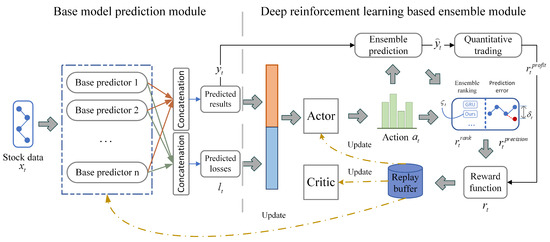 However, due to the increasingly complex stock data environment, it is becoming more and more challenging to make high-precision predictions using traditional single prediction models. Makridakis et al. [12] demonstrates that ensemble methods can enhance prediction accuracy and improve model stability by leveraging the strengths of individual models. Nevertheless, the performance of an ensemble prediction model is primarily influenced by the weight distribution of its base models, and finding the optimal weight distribution method remains a challenging problem [13,14]. Traditional ensemble methods [15,16] often overlook variations in predictive performance among different models, limiting the potential benefits of ensemble learning. Zhao et al. [17] evaluated the predictive performance of each base model through in-sample testing and calculated the weight of each model. They then used these weights to train the model for weight prediction, and finally, calculated a weighted average to obtain the ensemble result. Nti et al. [18] combined ensemble learning with a genetic algorithm and performed feature selection and parameter optimization simultaneously. Sun et al. [19] employed the adaptive enhanced regression algorithm to iteratively train and ensemble multiple LSTM models for stock index prediction. While the above methods do improve the accuracy of inventory forecasting to varying degrees, there is still room for further improvement in terms of time complexity. Fu et al. [20] proposed a dynamic time-series prediction ensemble model based on deep reinforcement learning (RLMC). This approach uses deep reinforcement learning to train an agent to automatically perform optimal selection and a combination of multiple prediction models, thereby enabling dynamic adaptation and optimization of prediction. By using deep reinforcement learning to output continuous actions to solve the model combination weight problem, the time complexity can be significantly reduced compared to discrete weight selection in traditional methods. In addition, compared with genetic algorithms and adaptive enhanced regression algorithms, the experience replay technology in deep reinforcement learning enables the storage and reuse of large amounts of historical data. Reusing historical data can greatly reduce the amount of training samples required, improve sample efficiency, and reduce the time complexity of each iteration.