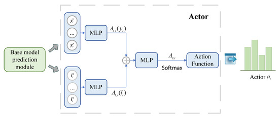 The actor is the key component responsible for strategy generation and action selection in deep reinforcement learning. By continuously learning and improving strategies, the agent can maximize its long-term rewards in complex environments. Figure 3 illustrates the specific implementation of the actor. To enhance the actor’s representational capacity and the independence of policy learning, three MLPs are employed. Each MLP is composed of three linear layers and two function layers. The initial two MLPs receive inputs and , respectively. The final MLP combines the outputs from the initial two MLPs. The actor’s final output is computed by applying the function to the final MLP’s output, and it undergoes additional adjustments in accordance with the temperature coefficient . controls the degree of exploration of action selection in the actor. By adjusting the value of , a balanced selection of model exploration and utilization can be achieved: