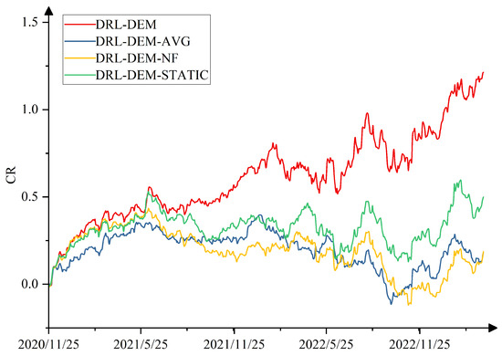 The results from the ablation experiments conducted on the SSE 50 and NASDAQ 100 datasets are presented in Figure 9 and Figure 10 and Table 5. These results clearly demonstrate that DRL-DEM outperforms DRL-DEM-AVG, DRL-DEM-NF, and DRL-DEM-STATIC across various metrics. Specifically, the SR values achieved by DRL-DEM are 2.20 and 1.53, superior to the other methods. At the same time, DRL-DEM obtains CR values of 1.38 and 1.21, along with ARR values of 0.45 and 0.40, again surpassing the other techniques. Furthermore, DRL-DEM achieves higher prediction accuracy, evidenced by lower MSE values of 0.011 and 0.005 as well as smaller SMAPE values of 7.41 and 6.19. Compared with DRL-DEM-AVG, the excellent performance of DRL-DEM fully proves the effectiveness of the weight optimization method based on deep reinforcement learning. In addition, the improvement in CR index of DRL-DEM compared to DRL-DEM-NF also highlights the key role of introducing real-time market feedback to improve the investment effect of the model. Finally, the comparison with DRL-DEM-STATI further emphasizes the importance of adopting a global collaborative optimization approach. The superior performance of DRL-DEM demonstrates that this method can effectively ensemble various base predictors to achieve more accurate predictions and achieve better performance in quantitative trading.