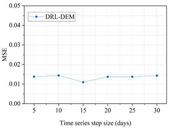 To evaluate the prediction stability of DRL-DEM, we conducted a parameter analysis for the time-series window length T. We experimented with various window lengths: 5, 10, 15, 20, 25, and 30 days. The results in Figure 11 reveal that a window length of 5 or 10 days can capture meaningful features. However, longer window lengths exceeding 15 days overly emphasize long-term historical data while neglecting short-term characteristics, leading to increased MSE. As a result, we selected a time-series window length of 15 days in our study.