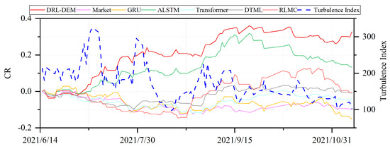 To assess the effectiveness of DRL-DEM in a complex market environment, we performed case analyses on the SSE 50 and the NASDAQ 100. The initial case analysis scrutinized the market conditions of the SSE50 Index spanning from June to October 2021. As seen in Figure 14, the SSE50 Index followed a downward trajectory from June to October 2021. Notably, there was a significant decline in July and August, with relatively minor fluctuations in other periods. This downturn resulted from a combination of macroeconomic factors, including a slowdown in China’s economic growth, decreased industrial production, and real estate regulations, all of which eroded market confidence. However, the ensemble optimization approach proposed in this study exhibited remarkable adaptability within this challenging market environment, effectively managing risks and delivering improved returns.