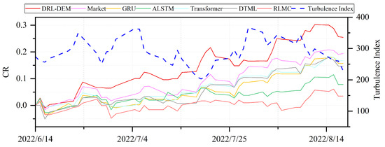 The second case analysis was conducted using the market conditions of the NASDAQ 100 Index between June and August 2022. Throughout this period, the Federal Reserve’s interest rate hikes and the market’s fluctuating expectations concerning future rate increases induced market instability. This instability is evident in the elevated levels of turbulence index and heightened risk. Nevertheless, in the face of these turbulent market conditions, as illustrated in Figure 15, our proposed model has consistently demonstrated its capacity to provide reliable forecasts, resulting in substantial returns for investors.