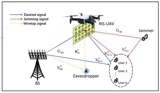 Considering that the actual communication environment may become increasingly complex, such as in densely populated areas with clusters of buildings, the links between the RIS and various nodes may encounter obstacles. Unmanned aerial vehicles (UAVs) have been widely used in complex communication networks due to their low cost and flexible maneuverability [,,,,]. In addition, when we mount the RIS on a UAV, the channel attenuation of the ground-to-air channel is much lower than that of the ground channel, which can significantly reduce the energy loss of passive reflection. The authors in [] utilized UAVs carrying reflective surfaces to facilitate power delivery to intelligent devices, while simultaneously transmitting information. Liu et al. used an AO framework to study a multi-controllable system for RIS-aided UAV communication []. In [], the authors studied the secrecy problem of RIS-based integrated satellite UAV relay networks with multiple eavesdroppers.