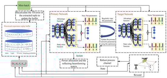 Prevailing reinforcement learning techniques, such as Q-learning, the policy gradient, and the deep Q-network (DQN), have demonstrated notable accomplishments in diverse control tasks. However, regarding the safety beamforming policy requirements discussed in Section 2, the policy gradient algorithm is inadequate for addressing Problem (9), as it involves continuous action space optimization and may converge to suboptimal solutions []. Furthermore, although the DQN performs well in in environments characterized by high-dimensional continuous state spaces and discrete action spaces, it remains plagued by several inherent limitations, which adversely affect algorithmic efficacy []. Therefore, the Noisy-D3QN-PER algorithm was developed to deal with the challenges in this paper, as shown in Figure 2, which can overcome the constraints associated with the aforementioned methods and significantly enhance the attainable performance.
