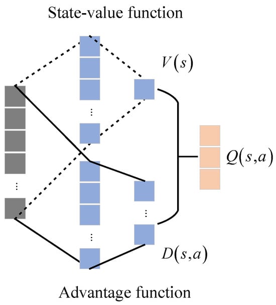In order to further enhance the algorithm’s performance, we incorporated the dueling layer [], resulting in the formation of the dueling double-DQN (D3QN). The core concept underlying the dueling layer is the decomposition of the optimal action value into the optimal state value and the optimal advantage . As such, the expression of the optimal advantage function is formulated as follows: