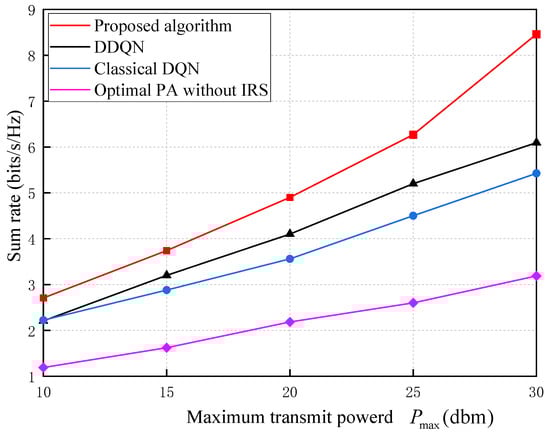 Figure 6 shows the achievable sum rate with varying maximum transmit power . Here, we set . As expected, the proposed algorithm outperformed other approaches. This was because the dueling layers modeling the advantage function and the state value function separately can better focus on states that are less correlated with the current strategy–action relationship and better predict the jammer’s strategy when the transmit power changes. Besides, the NoisyNet can prevent the proposed algorithm from becoming stuck at the undesired suboptimal solutions. It can be also observed that the three RIS-UAV-assisted approaches can obtain a much higher achievable rate than that without the RIS, which indicates that deploying the RIS-UAV can efficiently enhance the secure performance. To elaborate on this, the system can enhance the desired signals at the users and eliminate the jamming signal by adjusting the reflecting beamforming at the RIS.