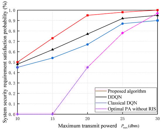 To further highlight the security performance enhancement of the proposed algorithm, the security requirement satisfaction probability (the probability of the satisfaction of the rate constraints [,]) of different approaches is shown in Figure 7. It is evident from the figure that the security performance of the optimal PA without the RIS approach cannot be guaranteed when the is low, and the security performance protection improved until was raised to a certain value. However, the other approaches with the RIS-UAV can obtain satisfactory performance at different , which further confirmed the superiority of deploying the RIS-UAV in wireless communication systems. Furthermore, it is noteworthy that the proposed algorithm achieved the best result as compared to other conventional approaches. This can be explained by the fact that the comparison approaches usually fell into the suboptimal solution, which only increased the achievable sum rate, but ignored the security performance requirement. However, due to the adopted NoisyNet and the security-aware reward function, the proposed Noisy-D3QN-PER algorithm can explore strategies and make a desirable balance between the security performance and the achievable rate.