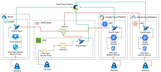 Figure 1 depicts the high-level architecture of the proposed honeypot that aligns with the design objectives above. The honeypot framework is designed to capture the attacks in real-time from the top four cloud service providers (AWS, Azure, GCP, and OCI). Each cloud service provider hosts a combination of a virtual machine and a network firewall. The firewall configuration allowed all internet traffic on ports 21/ftp, 22/ssh, 23/telnet, 80/http, 8080/http, 8983/http, 9200/http, 445/smb, and 55293/ssh. The underlying operating system used to configure the honeypot is Ubuntu 20.04 (Focal Fossa) LTS.