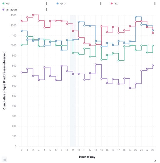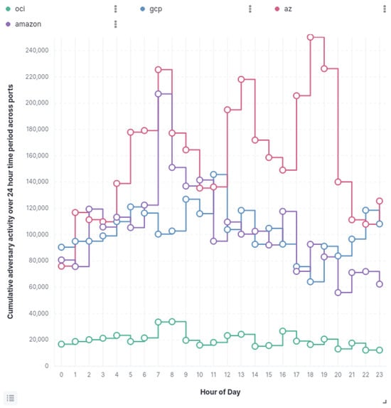 Figure 2 represents the distribution of attacks and originating unique IP addresses across 24 h. The graph shows that the attack spread of the connections from various adversary IP addresses is statistically distributed over the day across all the cloud platforms. Figure 3 depicts the total cumulative activity from adversaries across 24 h. The disparity of the attacks between cloud platforms can be derived by contrasting these two graphs. Based on the collected data, the Azure, Amazon, and GCP platforms appear to be heavily targeted, whereas the OCI cloud is the least targeted. Therefore, it is possible to infer that the adversarial incidence is higher on the cloud platforms that are established leaders as per the Gartner magic quadrant []. This higher incidence is because more customers and large organizations deploy their infrastructure on the leading cloud platforms than the niche players. Therefore, the adversaries can obtain higher Return on Attack (ROA) metrics by attacking the established cloud platforms.