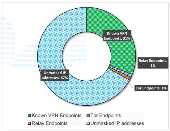 Around 32% of the traffic to honeypots is identified to have come from known IP masking services, such as VPN, Proxy, and Tor. The distribution of the IP address space across the cloud platforms is depicted in Figure 5. There is less proliferation of Tor and Proxy endpoints than VPN observed within the data because these masking services typically support only HTTP-based traffic, with lower adversary interest than other ports. Analysis of the top Autonomous System Numbers (ASNs) for the adversary IP addresses identified across the cloud platforms has yielded that the top seven out of ten ASNs used by adversaries are cloud providers. Therefore, it can be inferred that adversaries typically use cloud platforms and VPNs to mask their attacks while probing for security misconfigurations in the cloud. Further, no difference was observed in the traffic patterns when the public IP addresses of the virtual machines running honeypots changed over the course of this study across the cloud platforms.