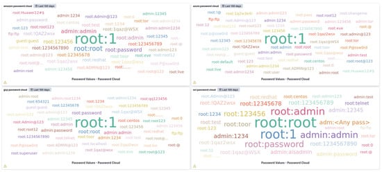 The analysis of the adversary attacks on SSH port and telnet port depict brute force of authentication credentials as the primary mechanism for intrusion. The honeypot was designed to grant access to any adversary randomly after 1 to 3 wrong attempts for a password; therefore, it is impossible to determine a complete wordlist used for brute force. Based on the inspection of the credentials used, it can be inferred that most adversaries have started the password brute force using the same passwords as the starting point to attack. These passwords are already part of common password lists such as rockyou.txt []. The most common passwords observed across the cloud platforms are represented in Figure 10.