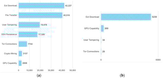 The adversaries opened 11,193 unique SSH sessions over seventy days. Each SSH session would span multiple activities from the adversaries looking to exploit the remote shell connection. A total of 411,172 individual activities were identified in the SSH honeypot. The most prevalent of these activities are represented in Figure 11a. Upon inspection of these activities, it can be inferred that downloading malicious packages from external sources (42,227 activities) and transferring files (40,516 activities) through various protocols is the most prevalent strategy of the adversaries. The external binaries, in this case, appear to deploy malicious botnet binaries into the compromised host that attempt to compromise other cloud infrastructure. Further, various adversaries also attempted to establish persistence by tampering with user profiles, modifying SSH keys (17,326 activities), mining cryptocurrency (3107 activities) within the virtual machine, and querying for GPU capabilities. It is interesting to note that port 55293, also running SSH service for management of the honeypot server, did not record a single malicious activity over seventy days across the cloud platforms.