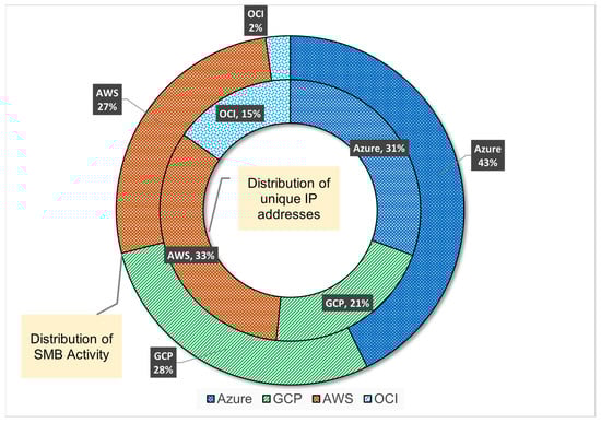 The analysis further revealed that the SMB port had been the highest targeted port compared to other honeypot ports exposed in the virtual machine. Figure 12 shows the total number of active SMB connections made across various cloud platforms from a unique IP address. Correlating this analysis with the research from Gartner [], it can be inferred that the leaders of cloud platforms (AWS, Azure, and GCP) have more active SMB protocol probing than the niche player, the OCI platform. Further, the activity for the SMB port for the OCI cloud platform accounted for only 2% of the total SMB port activity.