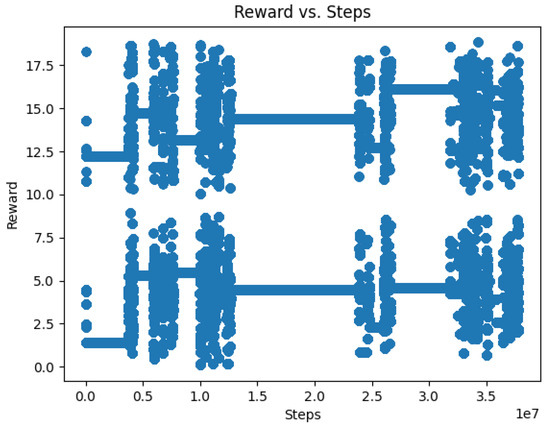 - Update the networks by sampling a random mini-batch of experiences from R and performing the following steps for each agent i. These Equations (3) and (4) [28] are a more general formulation of the update rules for the critic and actor networks in reinforcement learning, and they are also used in the MADDPG algorithm.The critic network is trained by minimizing a loss function:where B is the batch size, is the target value, and is the discount factor.The goal of updating the critic network is to improve the accuracy of the Q-value estimates.The actor network is updated by maximizing the expected return:where is the expected return, and is its gradient.