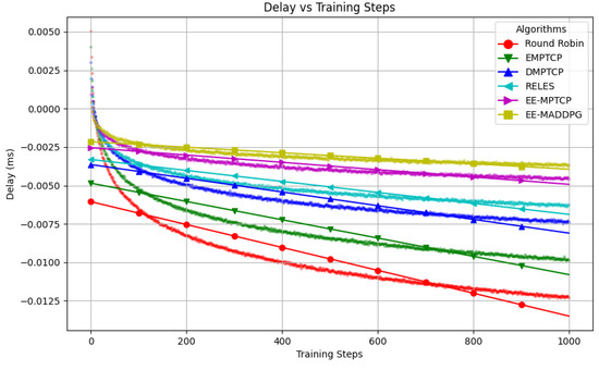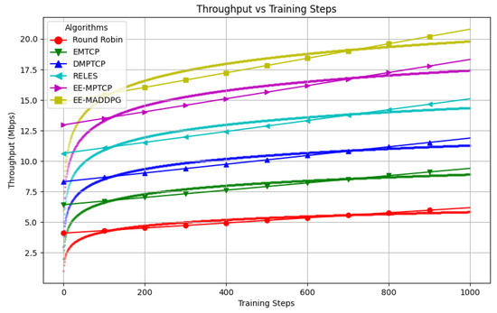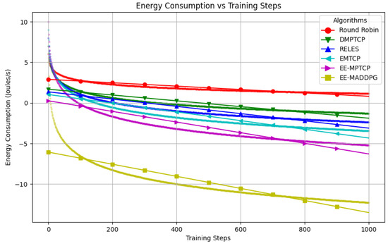 The proposed energy-efficient Multi-agent Deep Deterministic Policy Gradient (EE-MADDPG) scheme was subjected to a series of evaluations through simulations. Its performance was then compared with other MPTCP scheduling schemes, including Default Round Robin (RR), eMPTCP [49], EE-MPTCP [50], DMPTCP [51], and ReLes [25].