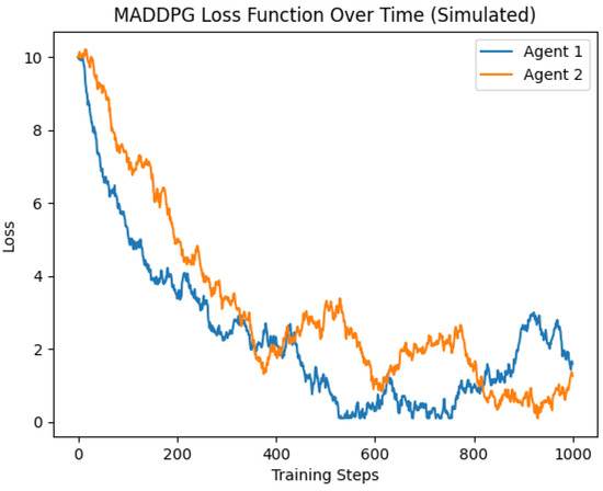 - Repeat steps 2–4, until the agents reach an optimal joint policy that cannot be further improved.These Equations (7) and (8) [28] describe the update rules for the critic and actor networks in the Multi-Agent Deep Deterministic Policy Gradient (MADDPG) algorithm.The critic network is updated by minimizing the loss function:where N is the number of agents, is the target Q-value, and is the discount factor.The goal of updating the critic network is to improve the accuracy of the Q-value estimates.The actor network is enhanced by optimizing the anticipated return.where is the expected return, and is its gradient.