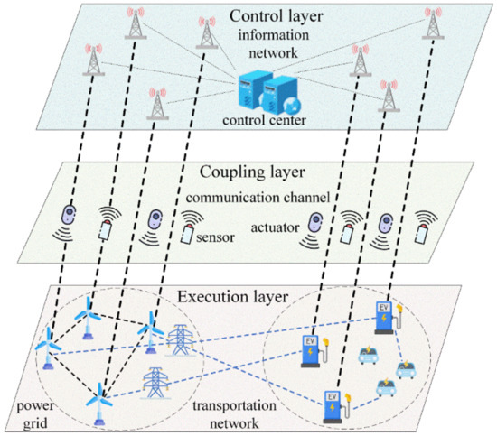 We represent the overall framework of the TNCS system as a whole, consisting of three layers, as shown in Figure 1. The execution layer consists of the actual power grid and transportation network, which is responsible for the reliable operation of energy interactions. The coupling layer mainly consists of power collection and control devices, as well as communication channels, and is responsible for information acquisition, execution of control commands, and information data transmission. The control layer, primarily based on the information network, is responsible for state monitoring and dispatch control.