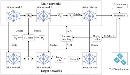 Structure of the restoration algorithm. First, the TNCS environment interacts with the actor network in the main networks, incorporating exploration noise. Specifically, this interaction indicates the state matrix , as the input to the actor network, and the actor network chooses an action based on . Then, the action can change the state matrix, resulting in a certain reward. Second, the obtained transitions from the interaction (transitions primarily include , , and ) are preserved in the replay buffer via experience replay. To train and update the actor network and critic network in the main networks, a batch-sized transition sample is selected at random. During the update of the critic network, a TD-error is generated and gradient descent is performed while introducing policy noise into the process. The actor network is updated using gradient ascent to maximize . The Target networks are updated after a certain number of updates to the main networks.