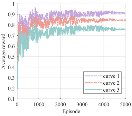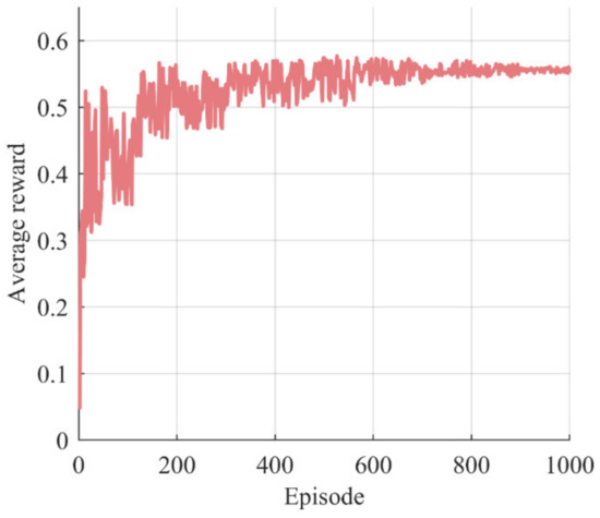 The ReLU function is used as the activation function in the hidden layers of all networks. The actor network is updated once after every three updates of the critic network. Set the discount factor to 0.99, the exploration noise standard deviation to 0.15, the policy noise standard deviation to 0.3, the batch size to 64, the total number of episodes to 1000, and the , , , and values to 0.5, 0.1, 0.1, and 0.005, respectively. The parameter , specifically, is used in the soft update.